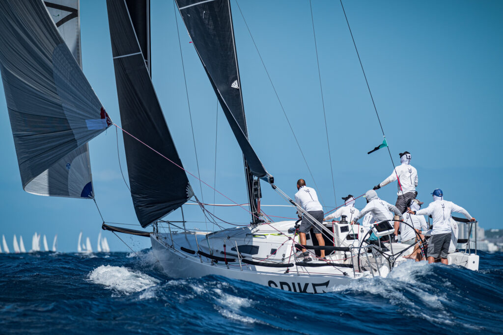 It was déjà vu seeing each fleet have their own frontrunners come in blazing with full sail, then after rounding the offset mark, would struggle with their spinnakers until the exact same bail out moment. Each holdout was forced offshore and downwind; and each ultimately gave up their battles in the same area. One fleet after the other, the top teams like El Ocaso, Spike, Solstice, FKG and Budget Marine all fell into the same spinnaker trap.